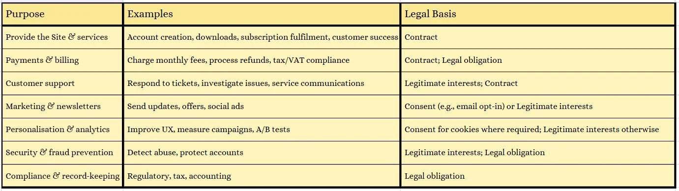 Legal, compliance, and safety: to comply with law, enforce my terms, protect rights, or respond to lawful requests.